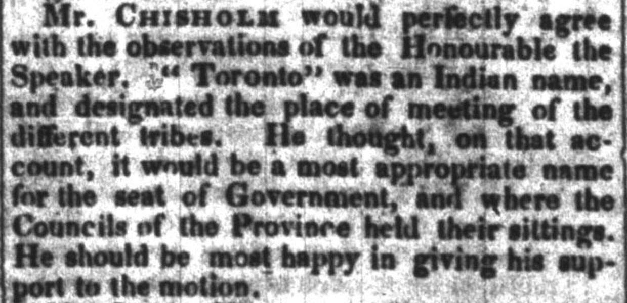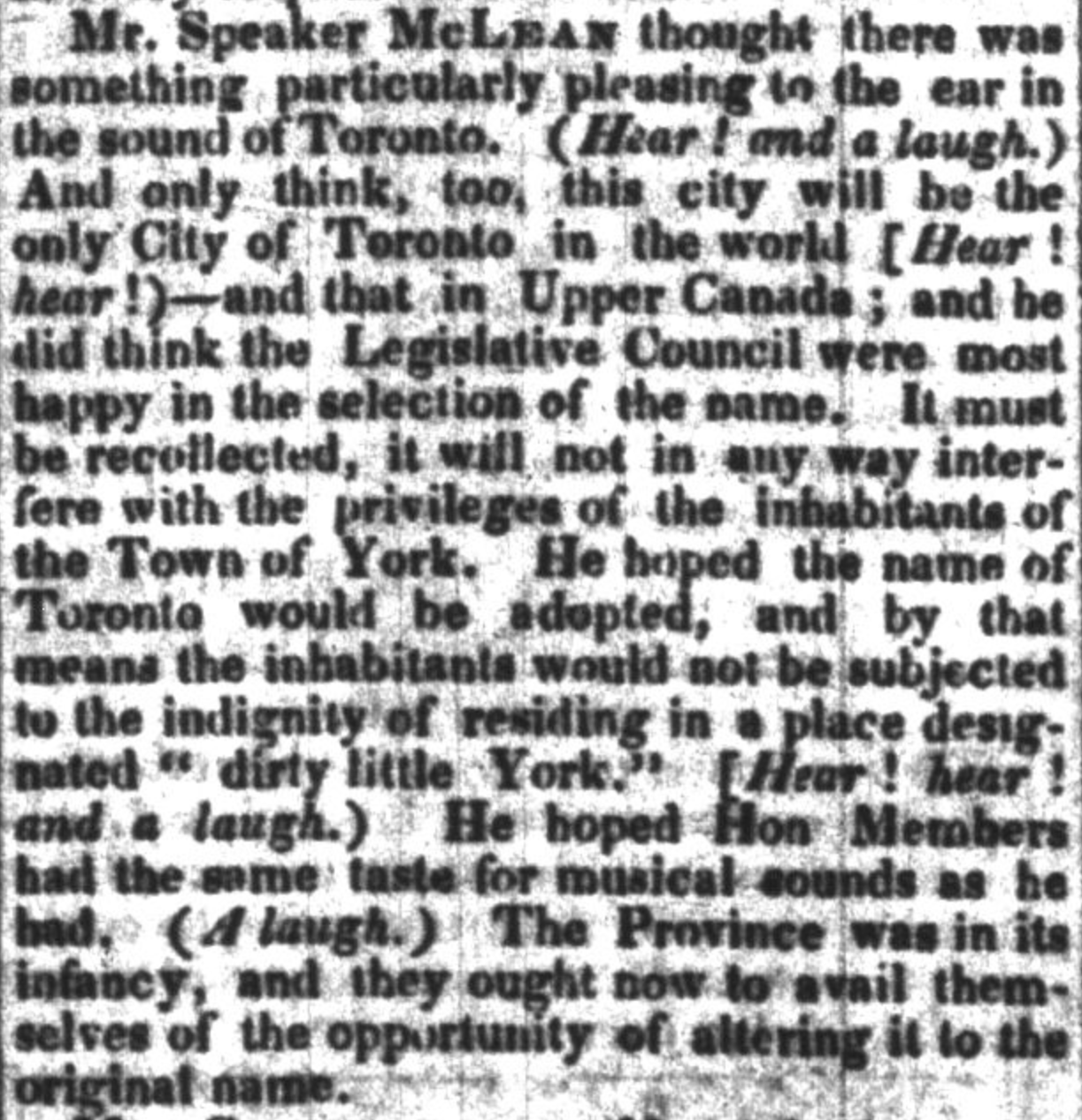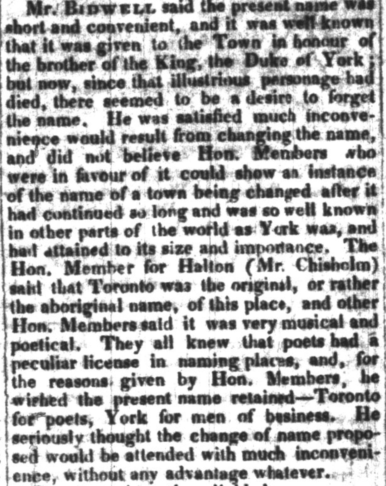 A Mr. Bidwell proposed (maybe sarcastically?) a middle path, offering that Toronto could be the city's name "for poets," with their "peculiar" tastes, while York could be retained "for men of business."